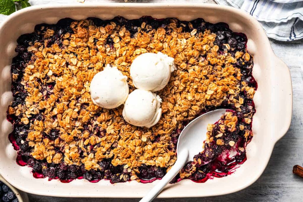 A blueberry crisp in a baking dish, topped with three scoops of vanilla ice cream, with a spoon resting in the corner.A blueberry crisp in a baking dish, topped with three scoops of vanilla ice cream, with a spoon resting in the corner.