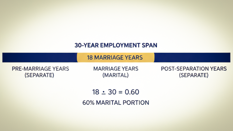 That is the place the coverture method is available in. The method calculates the marital portion by dividing the years of service throughout the marriage by the full years of service at retirement.