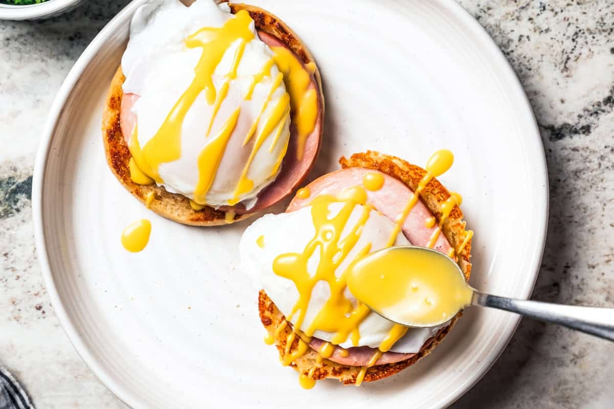 - Alter to style. In case your Hollandaise sauce is a bit thick to pour, add a splash of scorching water and mix. Add salt if wanted, and set the sauce apart whilst you prep your Eggs Benedict.