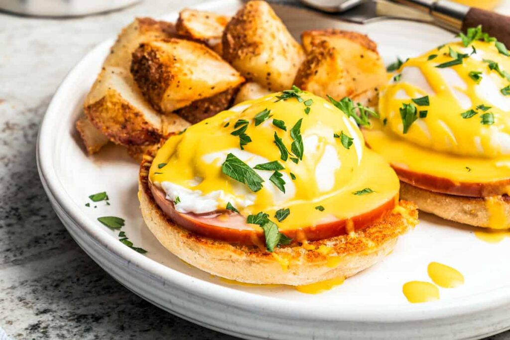 - Canadian Bacon – The standard selection for Eggs Benedict as a result of it’s already cooked and cured, and matches completely on prime of the English muffin. You can too use deli ham or common bacon, however prepare dinner the bacon first.