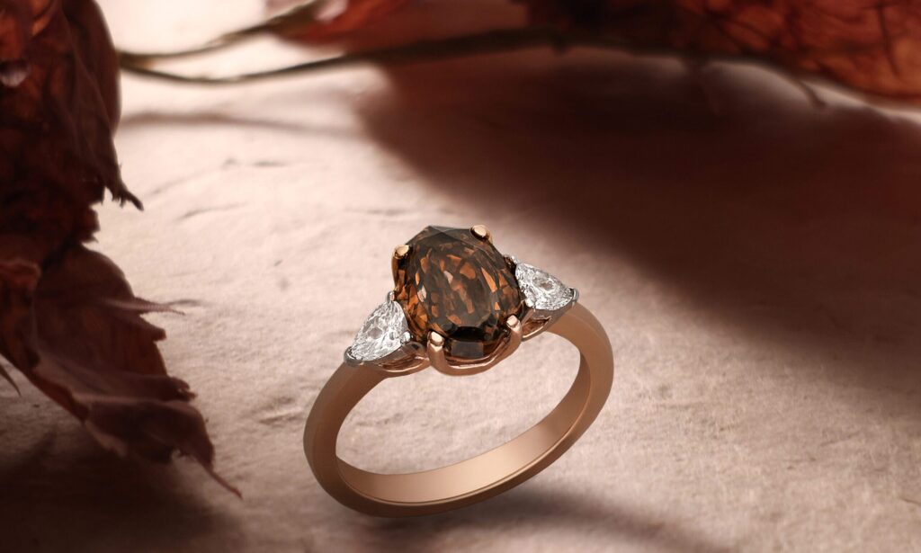 Different designs embody an 18ct rose gold three-stone ring set with a 2.33ct brown diamond and 0.35ct white diamonds, and a citrine half eternity ring in 18ct yellow gold.