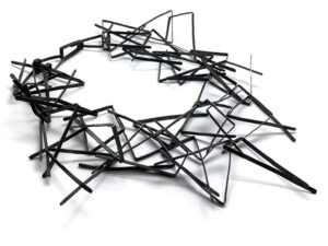 “In my youth, states Rebekah Frank, “Sunday mornings meant dressing up, usually together with removable collars, handmade and embroidered with care. I discovered these items uncomfortable, even embarrassing. A distinct sartorial expression was creating in me from a younger age, veering towards a minimal aesthetic, with a desire for layered, monochromatic textures. These draped chain necklaces are a part of a sequence that discover reminiscences of textiles from my childhood. Removable collars, T-shirt pockets, argyle patterns, and extra are created from linked chains. These items shock the wearer with the delicacy of their heft and the surprising consolation, confidence, and playfulness held within the act of carrying them.” This piece was a part of the exhibition Rings of Saturn 10/12 (Capricorn).