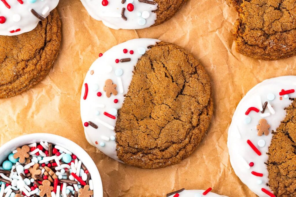 These gentle, molasses-rich gingerbread cookies are flavored with cozy spices and bake up thick and chewy. They’re further festive dipped in melted white chocolate and completed with sprinkles.